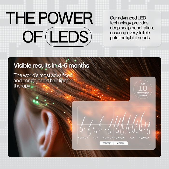 A revolutionary red light therapy hair growth device, designed to boost hair growth from home. Get thicker, fuller hair and restore your hairline in 6 months. Safe, effective, zero nasty side effects.