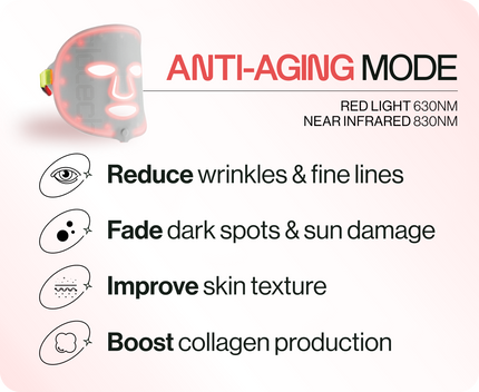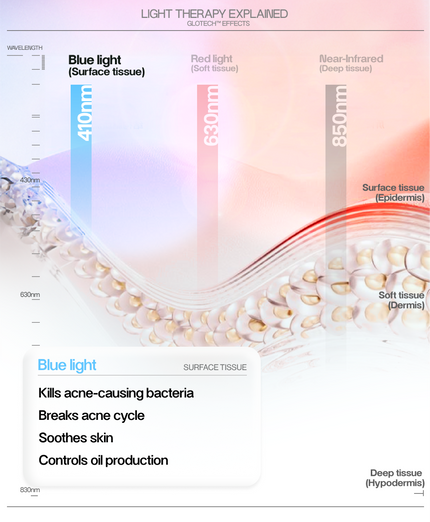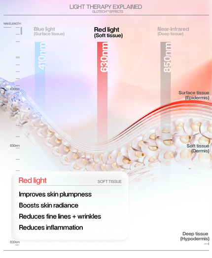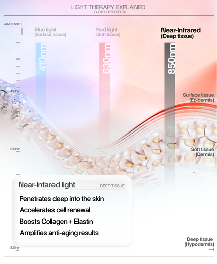 The Glotech™ Mask Pro and Collar utilize advanced LED light therapy, using specific wavelengths to target various skin concerns. Red light at 630nm stimulates fibroblast activity, enhancing collagen and elastin production to reduce fine lines and improve skin elasticity. Blue light at 415nm penetrates the skin's surface to eliminate acne-causing bacteria and regulate oil production. Near-infrared light at 830nm reaches deeper skin layers, promoting cellular repair and reducing inflammation. Together, these LED devices offer a comprehensive, non-invasive solution for enhancing skin texture and tone.